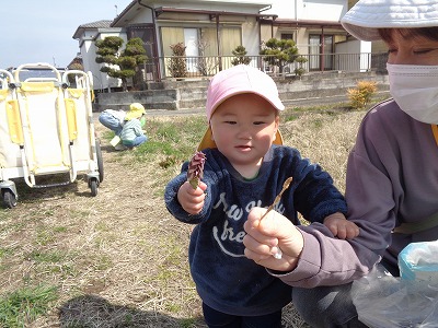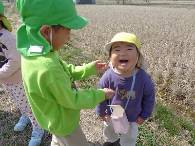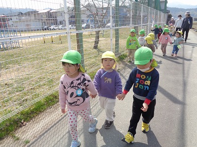 0歳児(たかしろ)3月24日(火)、久しぶりの良い天気でぞう組のお兄さん・お姉さんと一緒に八上小学校横へお散歩に行きました。