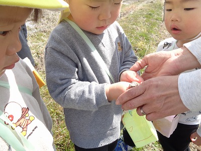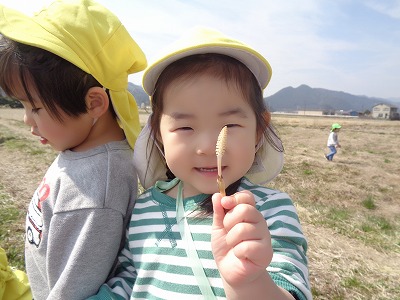 ツクシやホトケノザ、オオイヌノフグリなど春のお花が咲いていました。また、お兄さんが「カエルいたよ」と一緒に見せてくれましたよ。