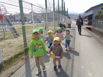 3月24日(火)、久しぶりの良い天気でぞう組のお兄さん・お姉さんと一緒に八上小学校横へお散歩に行きました。