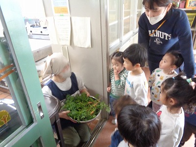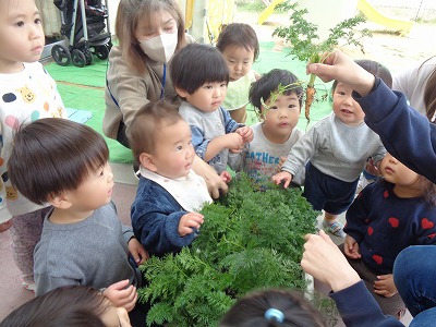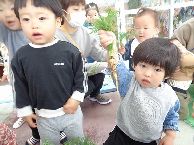 間引きした時よりもさらに大きくなったニンジンを見て、大喜びの子ども達。ぱんだ組やぞう組のお友達に「とったよー!」「ニンジン!!」と見せに行きました。給食で食べることを楽しみにしています(^^)