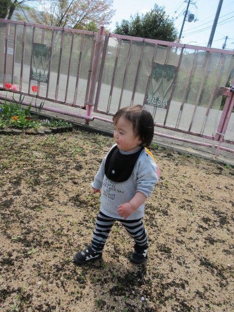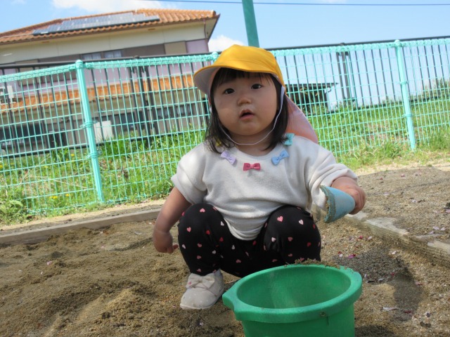 1歳児(城東)オレンジ色の帽子をかぶり、靴を履いて準備万端整えて、みんなで園庭に出発!!園庭内を散策したり砂場で遊んだり、滑り台を滑ったり好きな遊びを楽しみました♡