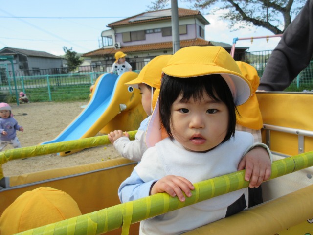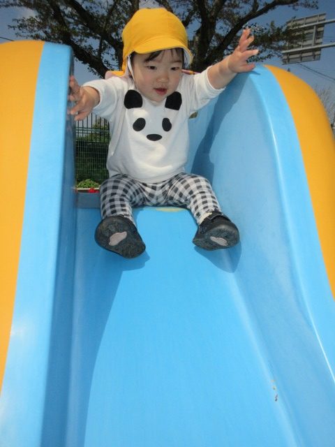 オレンジ色の帽子をかぶり、靴を履いて準備万端整えて、みんなで園庭に出発!!園庭内を散策したり砂場で遊んだり、滑り台を滑ったり好きな遊びを楽しみました♡