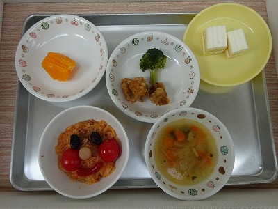 今日の給食は、元気100倍になる「アンパンマンライス」みんな大喜びで食べていました。