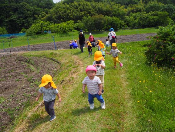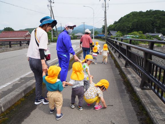 散歩に行ってきたよ♪ 0歳児(城東) 2023.06.07 城東保育園 お天気が良かったので篠山川の大きな橋を渡って、散歩に行ってきました♪♪目的地の田んぼに到着!!!おたまじゃくしやカエル、アメンボを捕まえ「カエルさん!!」「ぴょんぴょん!」と大喜びな子ども達でした。